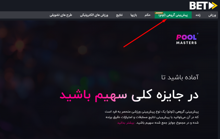 ۱- ورود به حساب کاربری: ابتدا وارد حساب کاربری خود در سایت بت فوروارد شوید و از نوار بالای سایت پیشبینی گروهی (توتو) را انتخاب کنید.