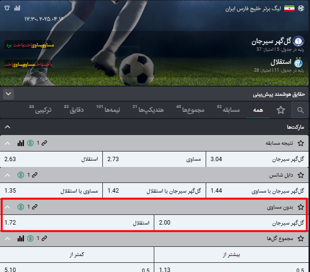 برای مثال فرض کنید میخواهید مارکت بدون مساوی را برای بازی گلگهر سیرجان – استقلال پیشبینی کنید.