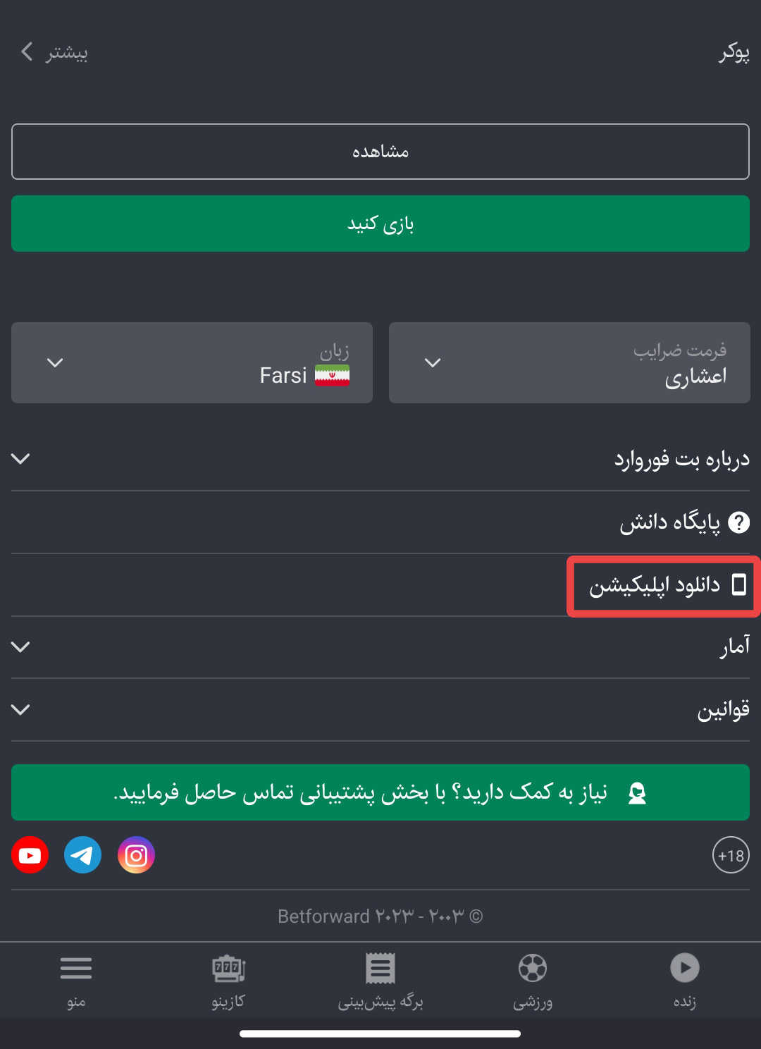 بخش کازینوی برنامه اندرویدی بت فوروارد