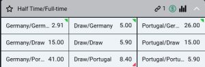 تصویر زیر مربوط به مارکتHT/FT در بازی آلمان مقابل پرتغال در سایت بت فوروارد است، چند گزینه را بررسی میکنیم: